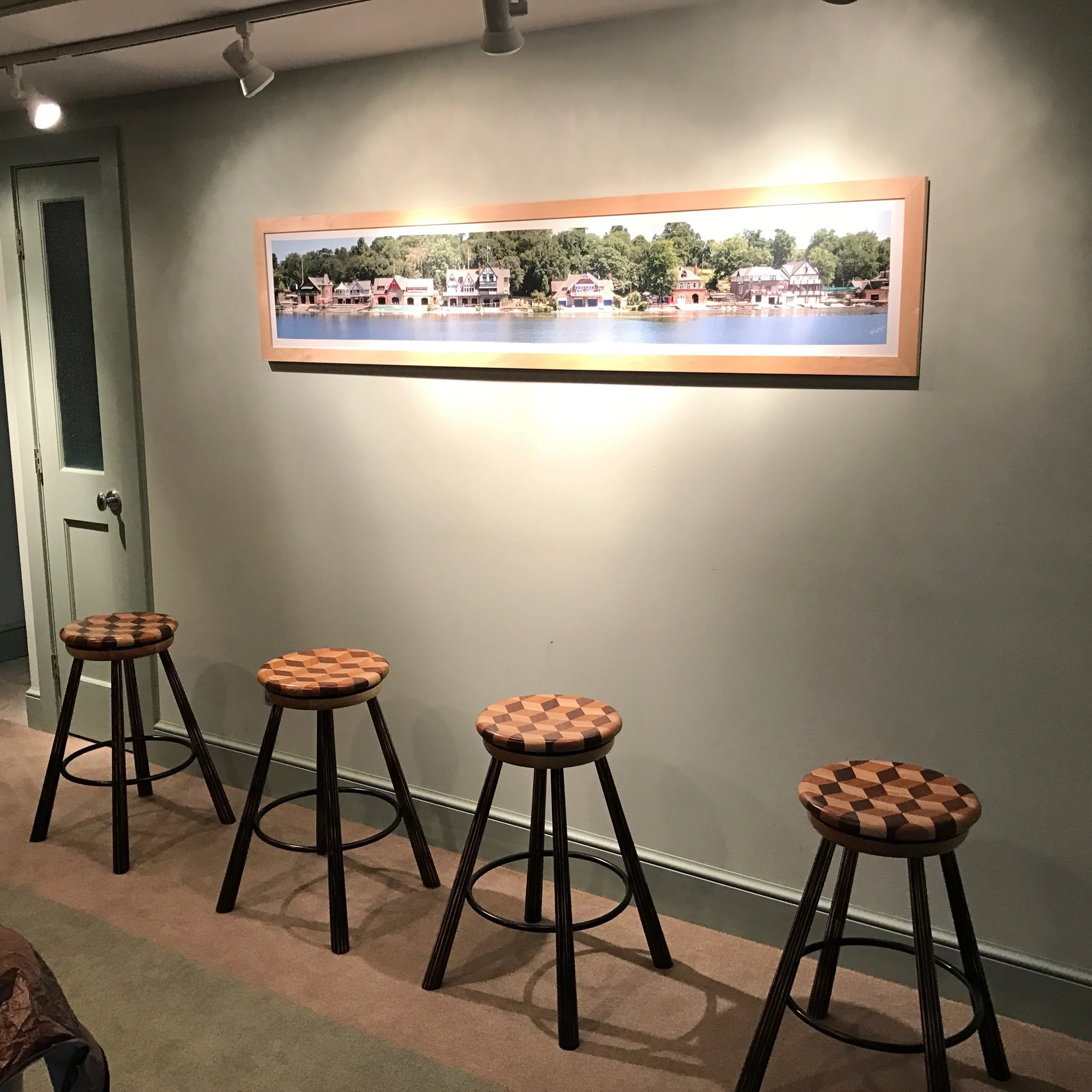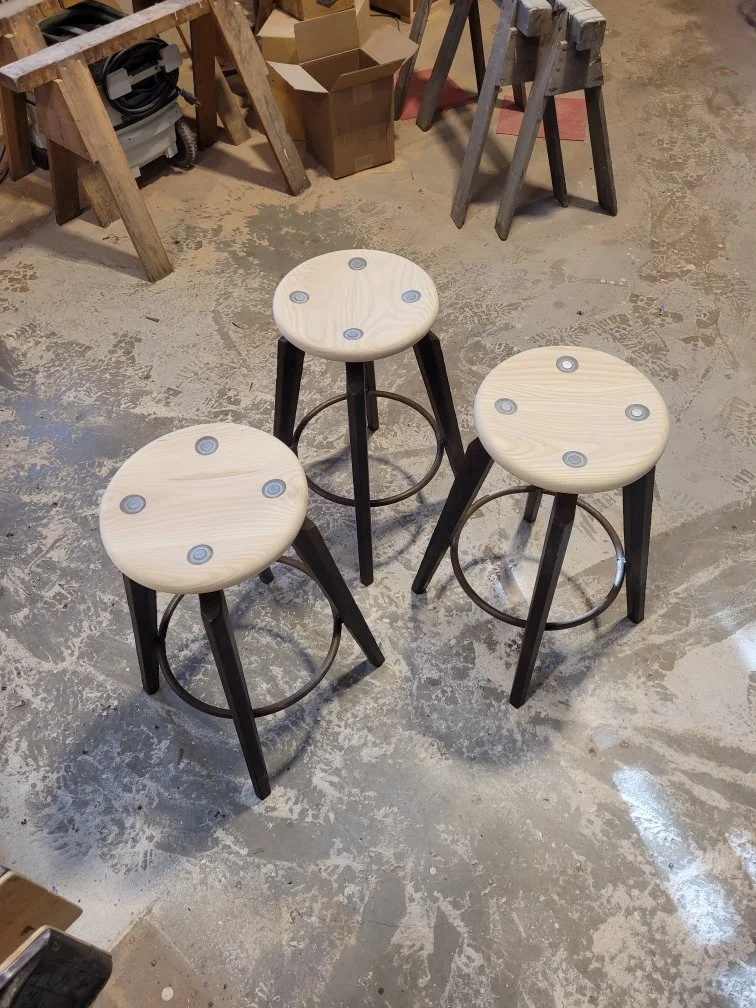 Prototype 3-D Barstool made when Colin was 18 years old with the help of his mentor, Brad Smith. Colin always LOVED geometric designs as a child. This led to the redesign and construction of the 4 swivel barstools in the picture below.
