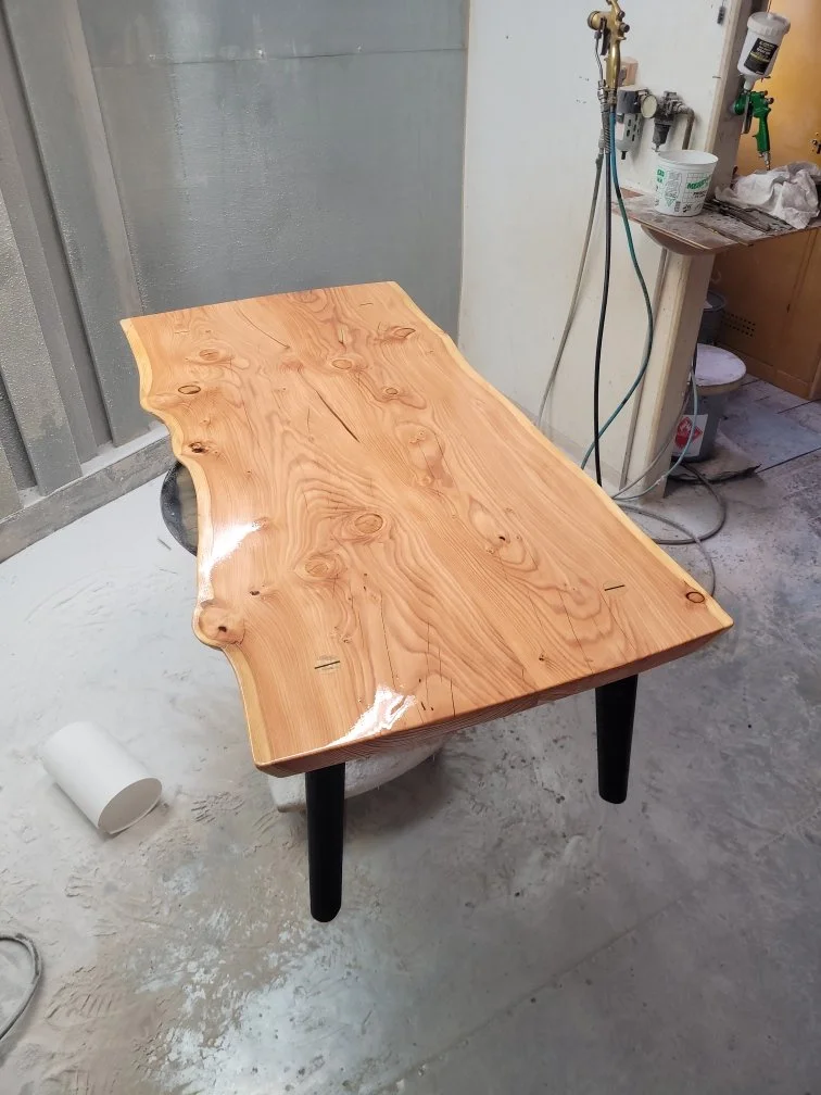 Ambrosia Maple Top and solid Black Cherry Legged Desk Colin made for his Mom and Dad as his first table. That Ambrosia maple came from a dying silver maple log we cut down at our house, milled and dried helped make this so unique. A cool story!